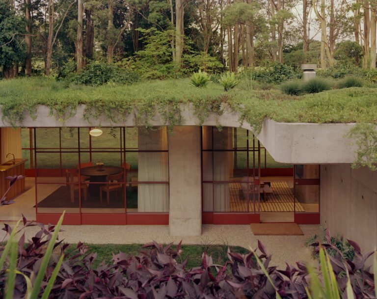 This residence blends raw textures with lush greenery, creating a serene retreat where nature and modern design meet.